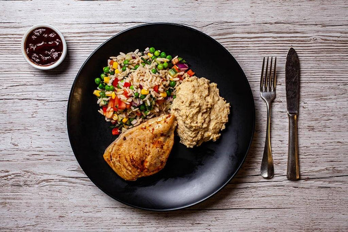 chicken breast, corn, beetroot, tahini, cumin, olive oil, garlic, rice, salt, pepper, lime juice, pea, tomato, broccoli, green beans, red radish, umami, lemon juice, pepper.