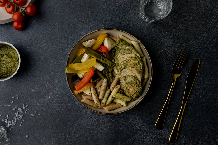 penne pasta, crushed tomato, tomato puree, garlic, paprika powder, oregano, basil, thyme, chicken breast, rapeseed oil, salt, pepper, romanesco cauliflower, green beans, sundried tomato.