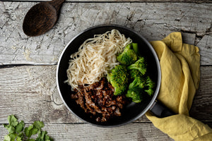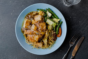 rice noodle, broccoli, carrot, bamboo shoots, korean chili paste, garlic, onion, tomato paste, hoisin sauce, togarashi, vegetable stock, tofu, rice wine, sugar, ginger, soy sauce, anise, orange marmalade, orange zest, ginger powder, garlic powder, cinnamon, clove, onion powder.