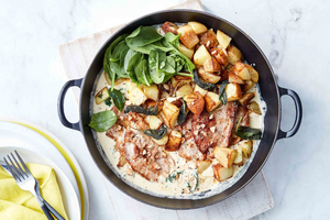 potato, cream, salt, pepper, green beans, zucchini, oregano, thyme, marjoram, basil, ham, soy milk, green peppercorn, onion, garlic, thyme, bay leaf, oregano, potato.
