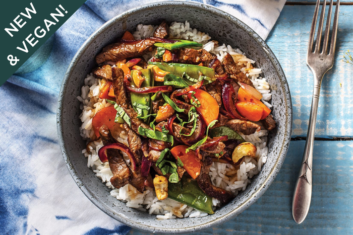 Tofu (soja), ris, morot, grön böna, paprika, salladslök, hoisin (vatten, sojabönspasta (sojabönor, vetemjöl, vatten, salt), socker, ingefära, risvin, salt, sesamolja, lök, sirap, majsstärkelse, chilipeppar, vitlök, vinäger, vitlök), stjärnanis, soja, ingefära, jordnötter, vitlök, vårlök, sesamfrö -